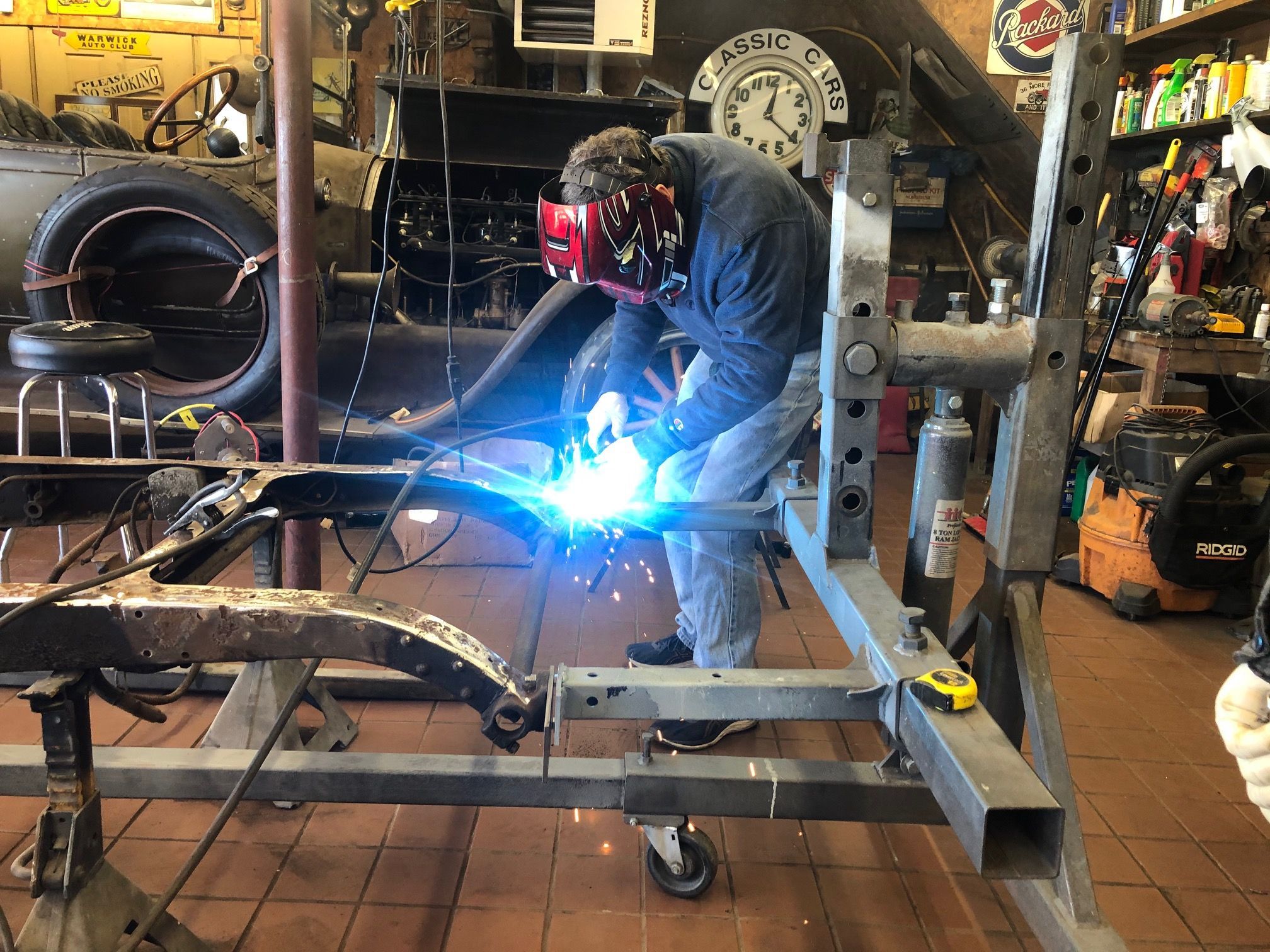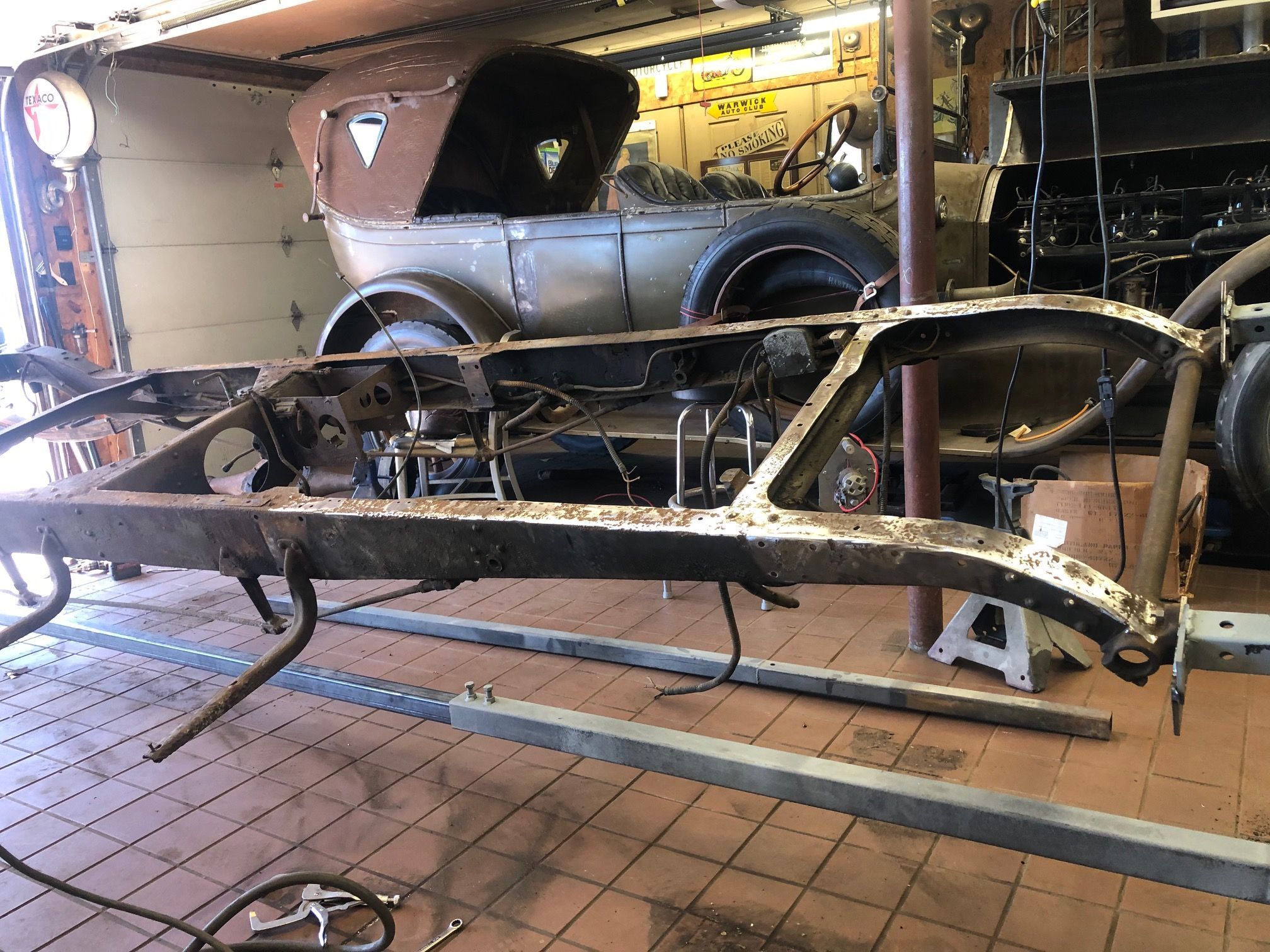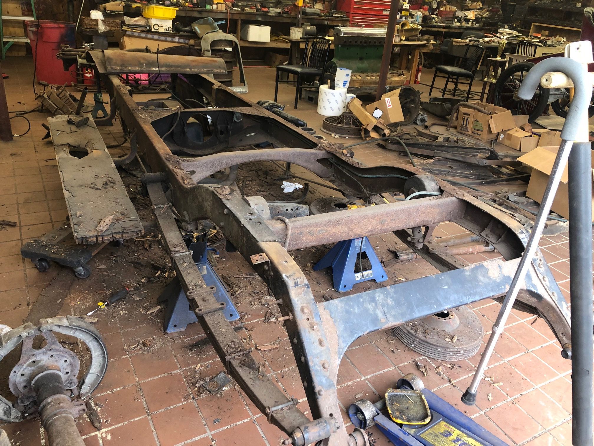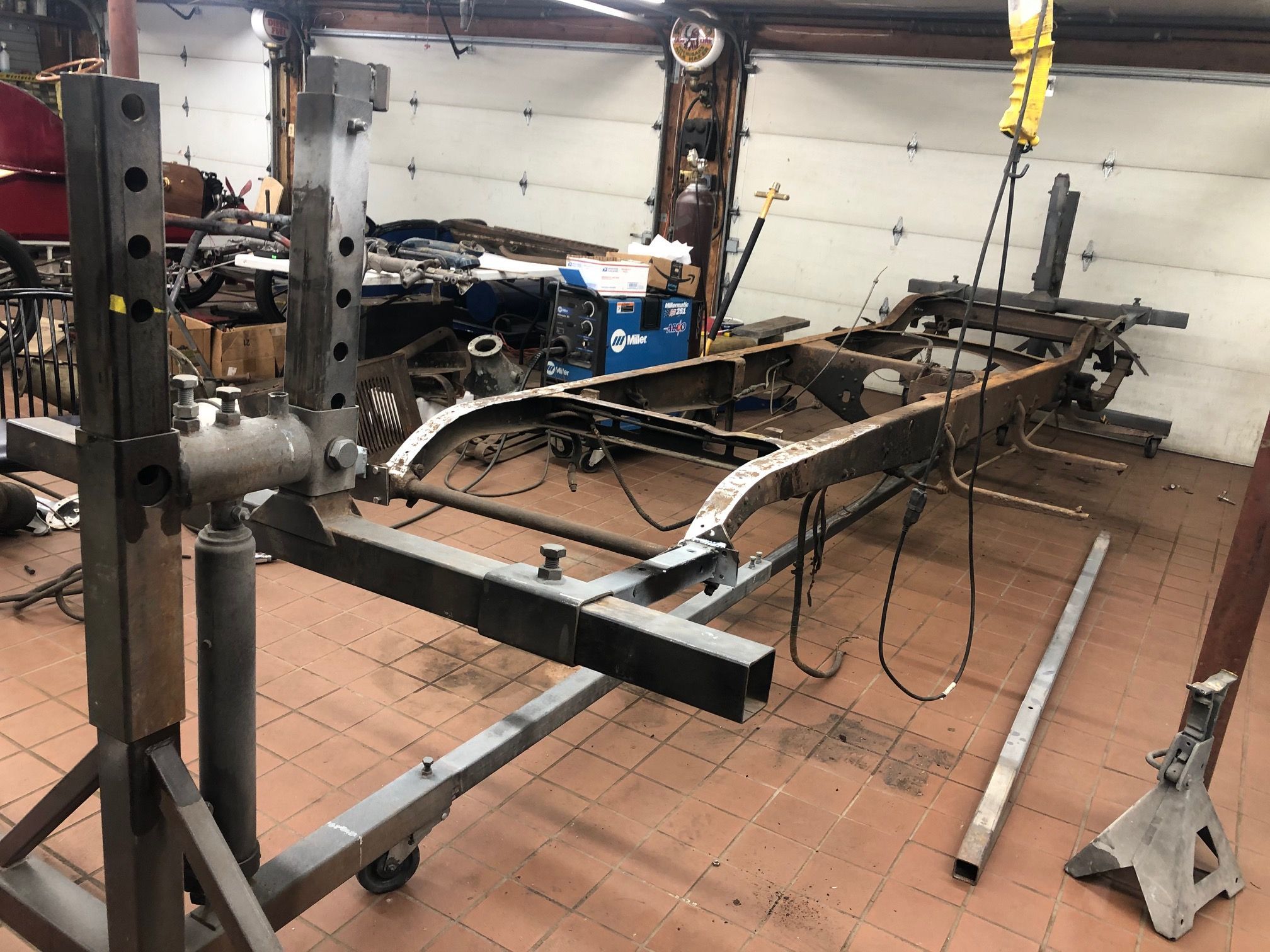 A "Frame Rotisary" (as spelled in the parts and tools catalog) designed for easier mobility and access for sand blasting is being custom fit to the chassis.