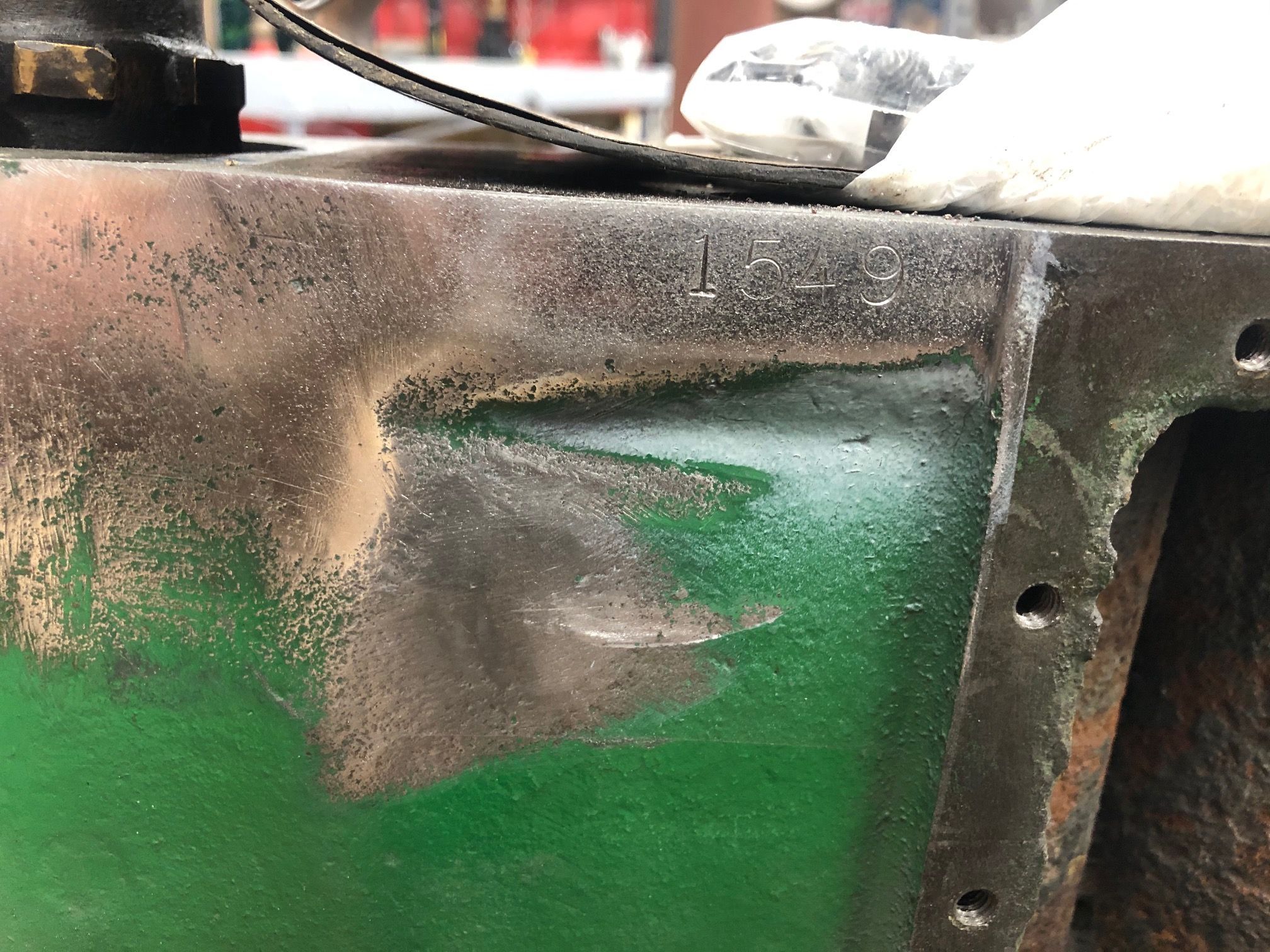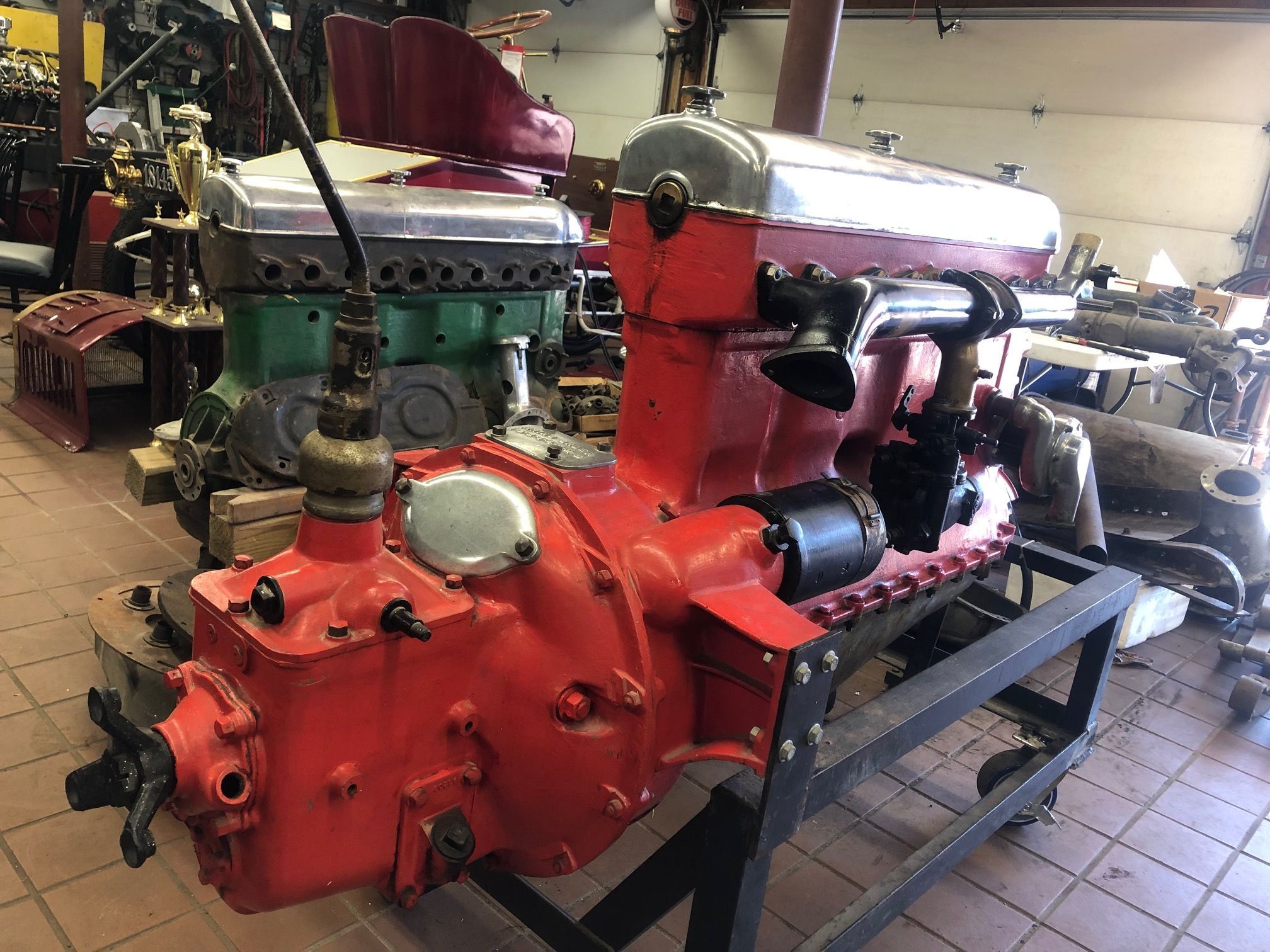 Transmission side of "complete" engine. After doing an inventory of parts for this engine, we note that many parts are missing. As of March 2021, the former owner has assured us that these parts will be located and sent to us soon.