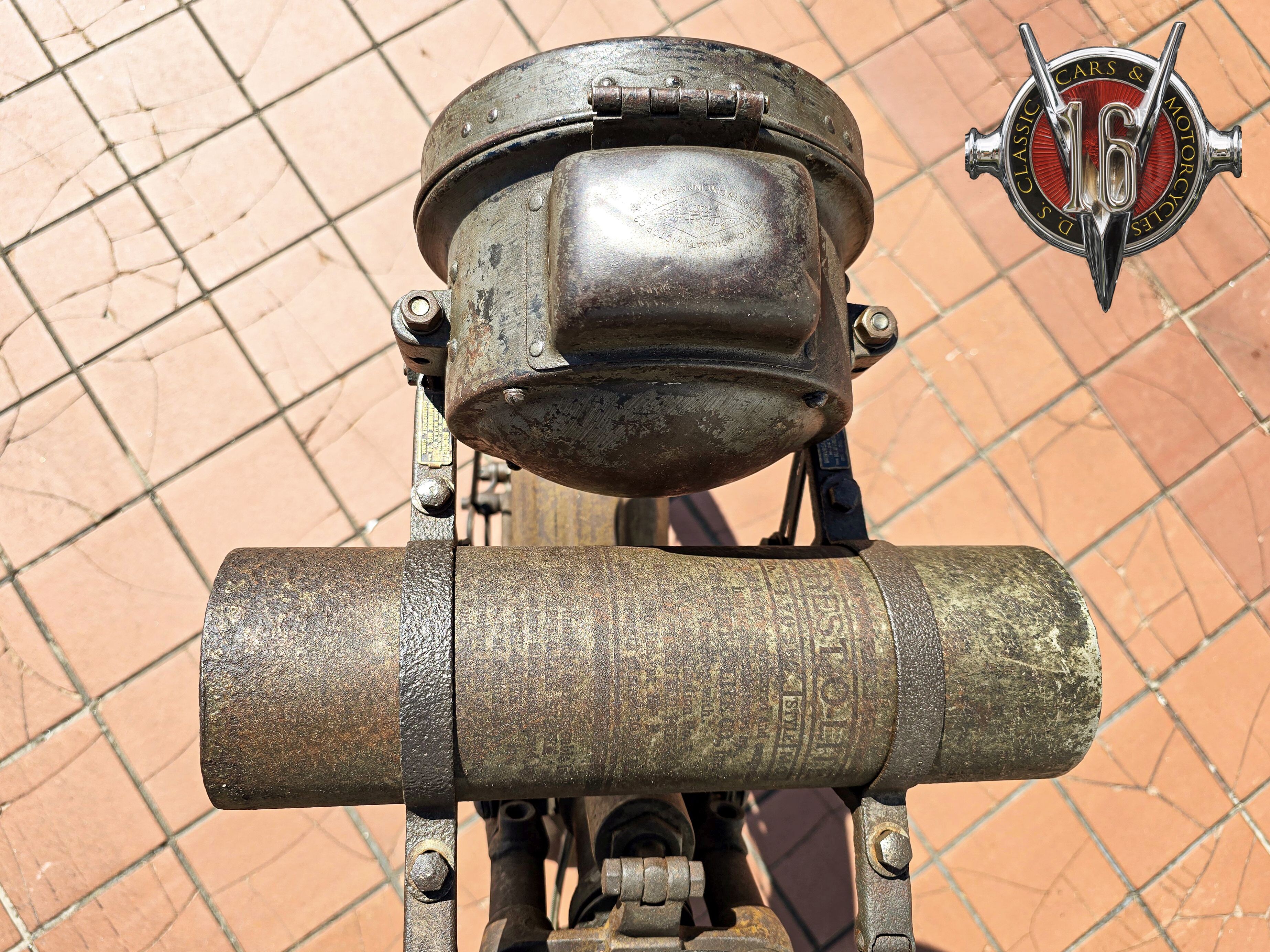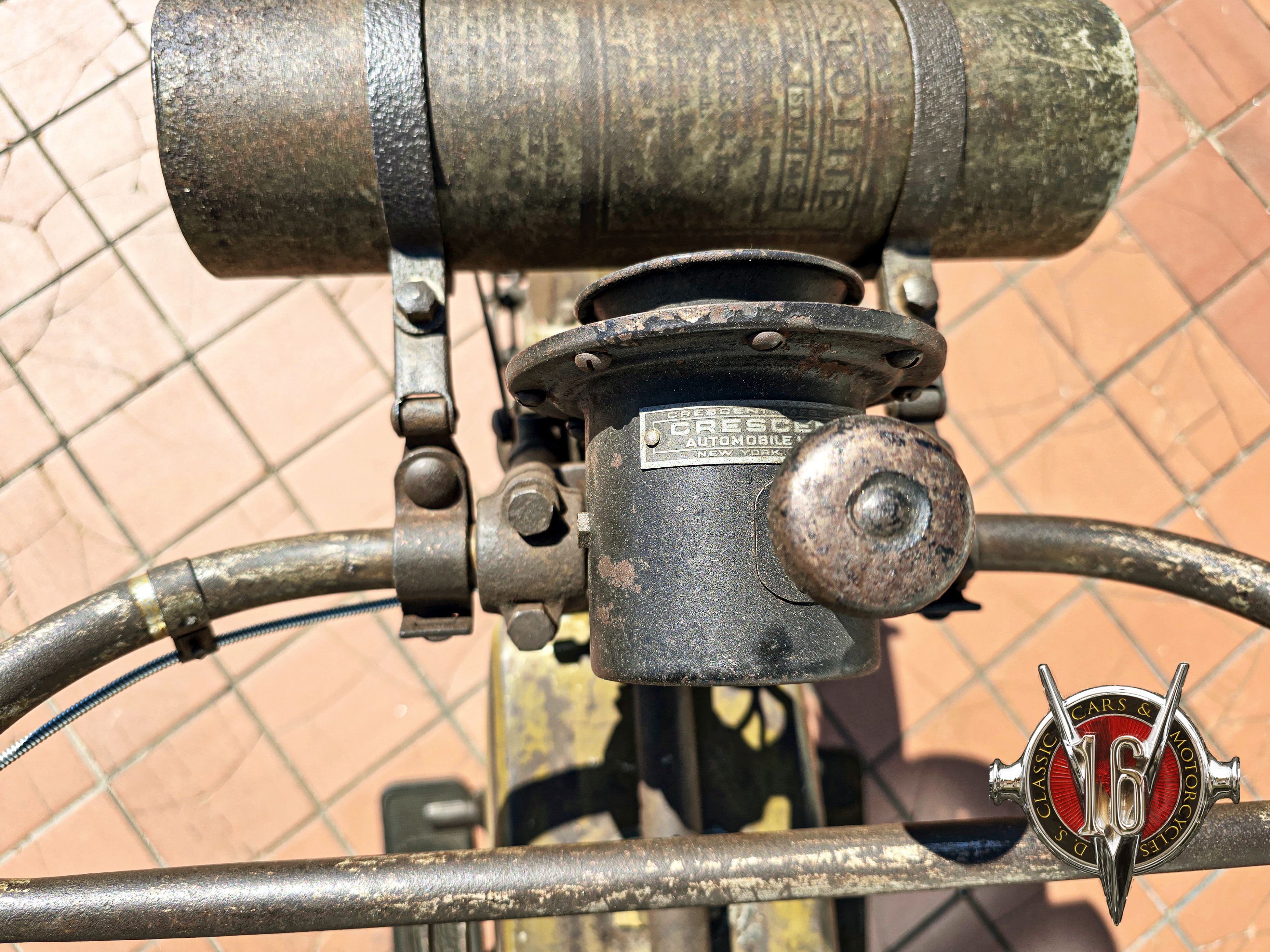 taillight, Bosch magneto, Crescent Mfg. Co. horn, and it features a luggage rack and Prest-O-Lite tank. Presented in