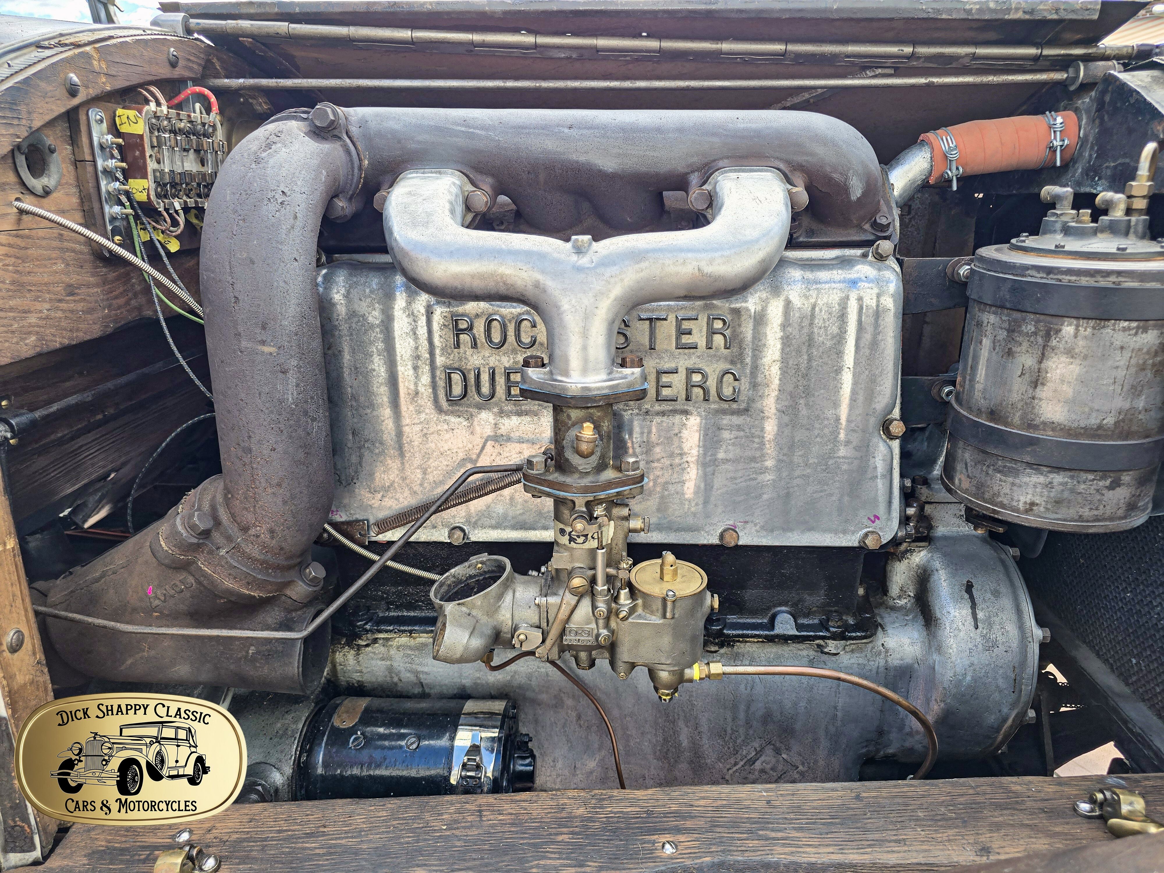 Duesenberg engines were operated by a complex rocker-arm arrangement hidden behind a polished